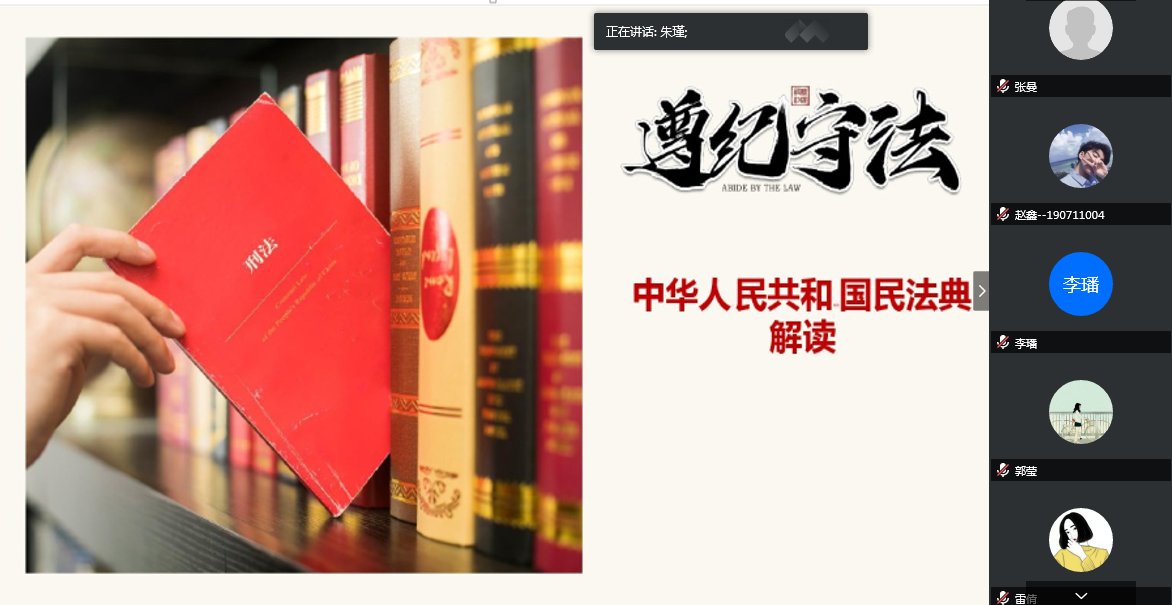 6月17日上午,beat365在线唯一官网研究生第三党支部开展“法治新时代聚焦民法典”线上主题党日活动,在线学习了《中华人民共和国民法典》。会议由党支部书记朱瑾主持。
