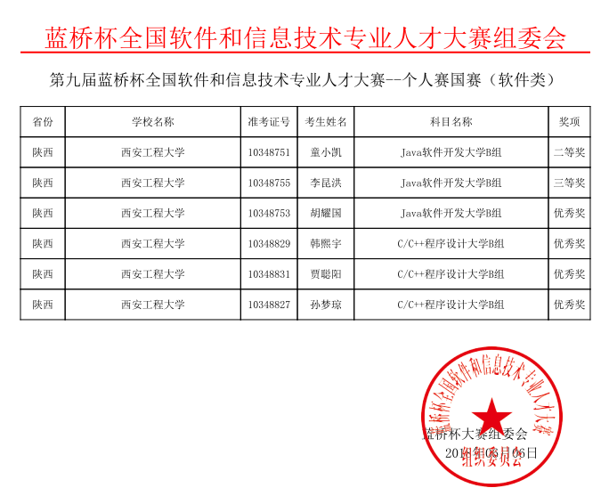 “第九届蓝桥杯全国软件和信息技术专业人才大赛”全国总决赛于5月26日在北京隆重举行,来自千余所高校的5000余名蓝桥杯省赛一等奖选手云集京城,角逐蓝桥杯最高荣誉。beat365在线唯一官网高晓娟老师、王爱丽老师带领着6位同学参加C/C++程序设计和JAVA软件开发全国大赛。最终,童小凯获得了JAVA软件开发二等奖,李昆洪获得JAVA软件开发三等奖,胡耀国获得JAVA软件开发优秀奖,韩熙宇、贾聪阳、孙梦琼分别获得C/C++程序设计优秀奖。
