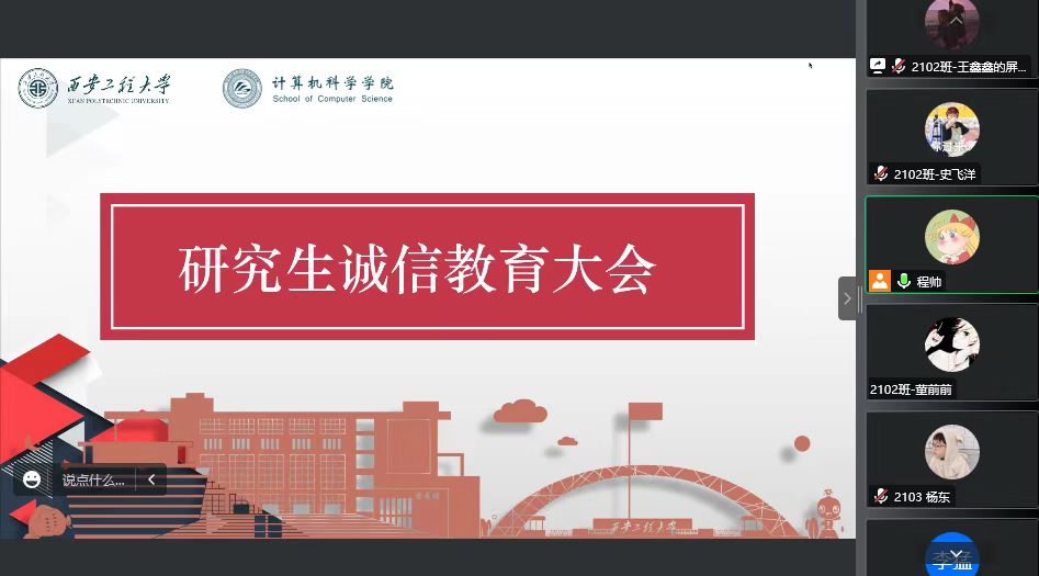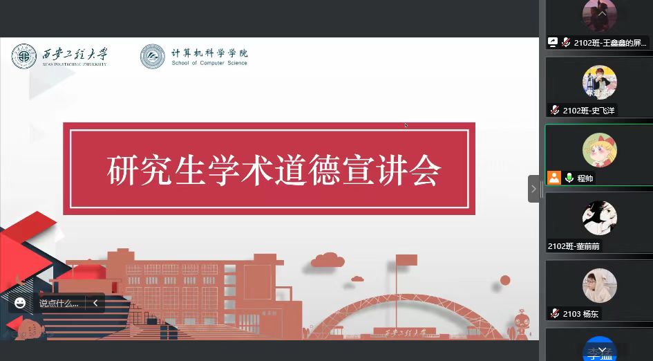 为贯彻陕西省高校疫情防控工作相关会议精神,落实学校疫情防控最新工作要求,加强我院研究生学术道德和诚信教育,11月30日下午,我院举办了线上研究生疫情防控教育管理大会暨研究生学术道德和诚信教育大会。研究生辅导员程帅和全体研究生参加了此次会议。