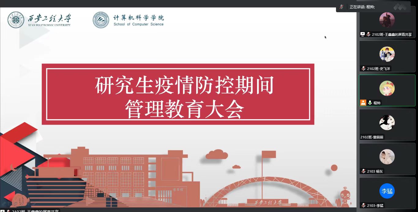 首先,程帅就疫情防控提出了几点要求。一是教育学生要进一步强化责任意识和阵地意识。她指出,当前校园疫情防控已到了攻坚时刻,形势在不断向好的方向发展,但是千万不能麻痹大意,一旦出现一丝漏洞前面的防控成果就可能前功尽弃。二是要求同学们要提高政治站位,严格遵守学校疫情防控各项规定。接着,她提醒同学们如在科研、生活等方面遇到问题要及时和导师、辅导员老师、班委沟通,学院将倾力协助同学们解决。最后结合近期学校和学院发生的诈骗案例向同学们强调要注意和提醒自己家人保护好个人信息,防范电信网络诈骗和其它骗术。