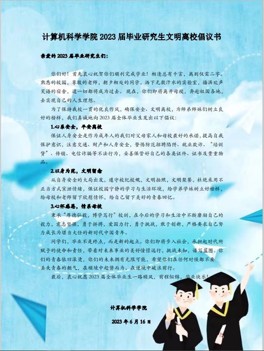 为保证毕业研究生走好离校前最后一站路,学院于6月16日向全体毕业研究生发布《beat365在线唯一官网2023届毕业研究生文明离校倡议书》,从人身安全、文明离校、感恩母校老师等方面发出倡议:全体毕业研究生要增强安全意识和自我保护意识,保障人身财产安全;充分发挥先锋模范作用,严格遵守校规校纪,做到安全、文明离校;秉承“厚德弘毅,博学笃行”校训,感恩母校、老师培养,在今后的学习和生活中不断磨砺自己,努力成长为堪当大任的新时代中国青年。