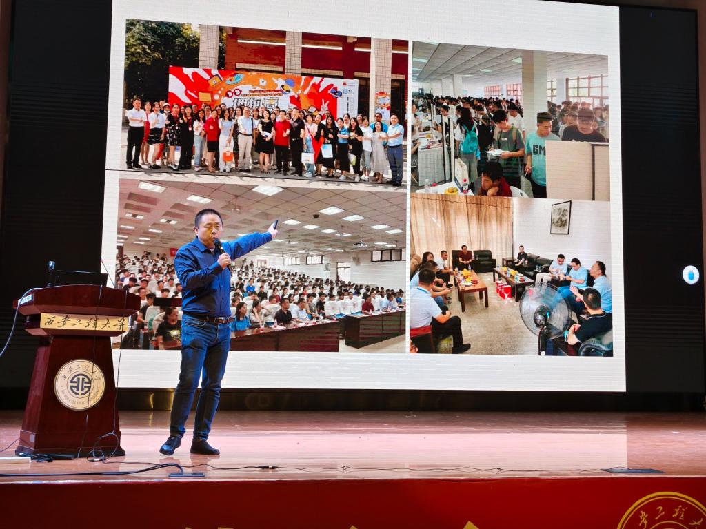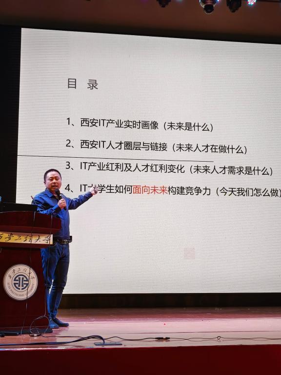 蔡鹏从自己的职业发展路径出发,围绕当前经济发展环境、西安IT产业发展及人才需求现状、IT大学生职业生涯规划、高校IT专业创新创业教育等多个方面做了精彩讲述。他着重介绍了西安IT产业实时画像,包括36家世界500强企业和52家中国软件百强企业,让在座学生了解了西安IT产业全貌。他又从IT产业发展红利及行业人才红利变化的角度,展示了全国信息技术相关行业应届本科毕业生薪酬及主要城市工作机会分布情况。最后,他就IT大学生如何面向未来构建核心竞争力进行了详细阐述,让同学们对于信息技术服务业招聘需求、简历筛选重点、IT大学生面对市场应有的核心竞争力有了更加清晰的认知。