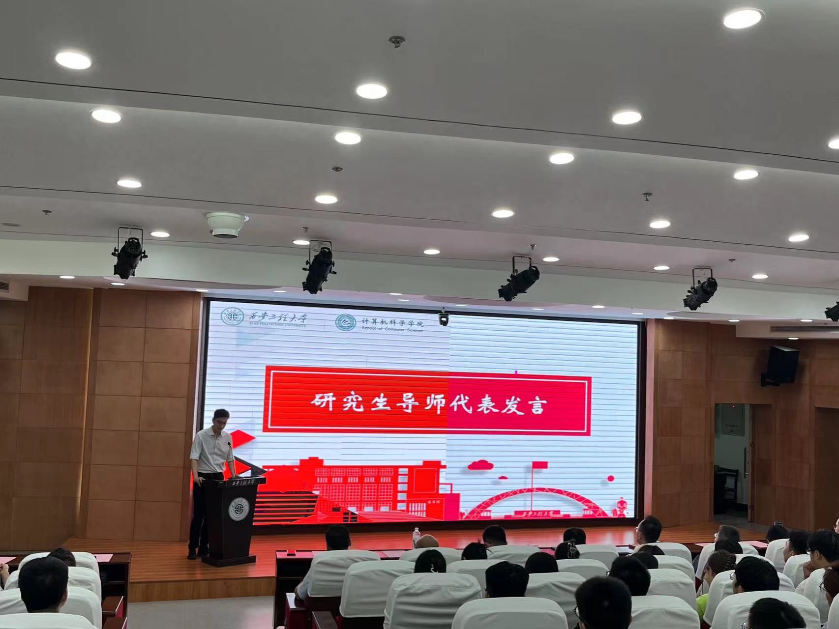 接着,研究生导师代表、智能科学与技术系主任杨博副教授发言。他在发言中结合自身求学执教科研经历,和同学们分享了几点体会并提出了几点建议:一是建议同学们确立清晰的学术目标和个人发展规划;二是建议同学们通过不断学习,努力探索,持续保持对研究领域的热情和好奇心;三是建议同学们和导师密切配合,和团队同学亲密合作,促进自身科研能力的培养和学术素养的提升;四是建议同学们对时间进行有效管理并保持良好的身心健康。