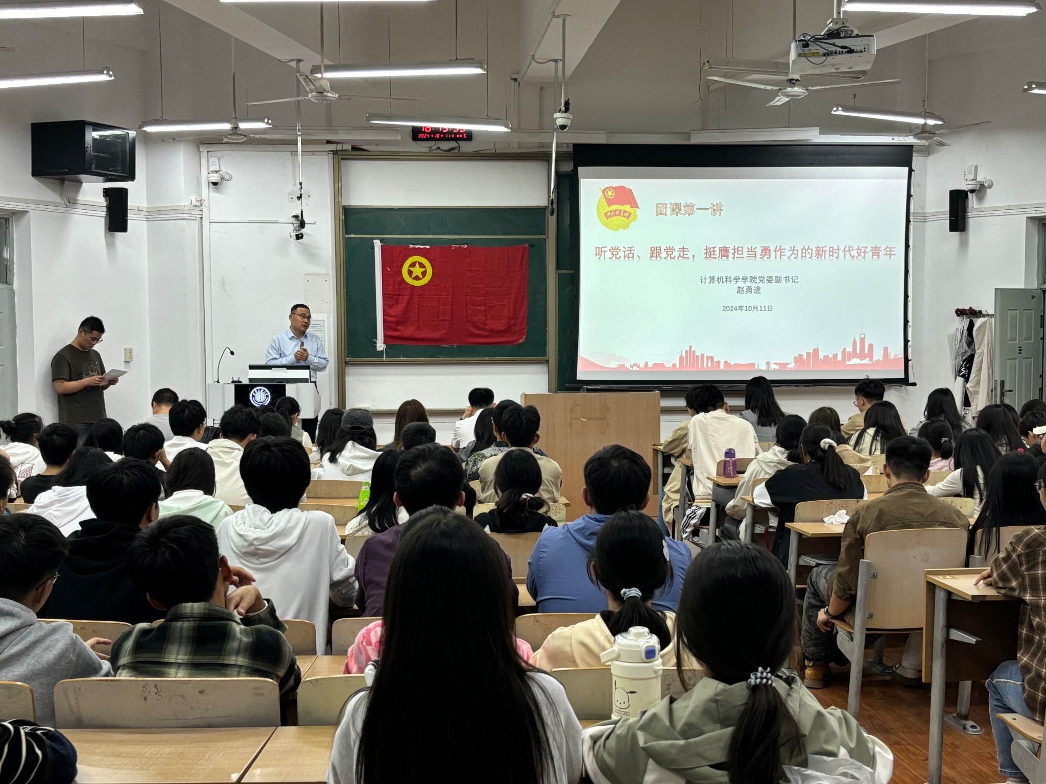 开班仪式结束后,赵勇进为在座学员讲授了团校培训第一讲,题目是《听党话、跟党走,挺膺但当勇作为的新时代好青年》。在讲课中他首先回顾了中国共产党的光辉历程,从革命年代的烽火连天,到社会主义建设时期的筚路蓝缕,再到改革开放的波澜壮阔,直至新时代的激荡澎湃。他强调,作为新时代的青年,必须深刻理解党的历史,铭记党的恩情,坚定不移地听党话、跟党走。接着,他结合当前国内国际形势,阐述了新时代青年所肩负的历史使命和责任担当。他指出,当今世界正处于百年未有之大变局,我国正处于实现中华民族伟大复兴的关键时期。面对这样的时代背景,新时代青年必须挺膺担当,勇于作为,积极投身中国式现代化建设和中华民族复兴的伟大事业中。
