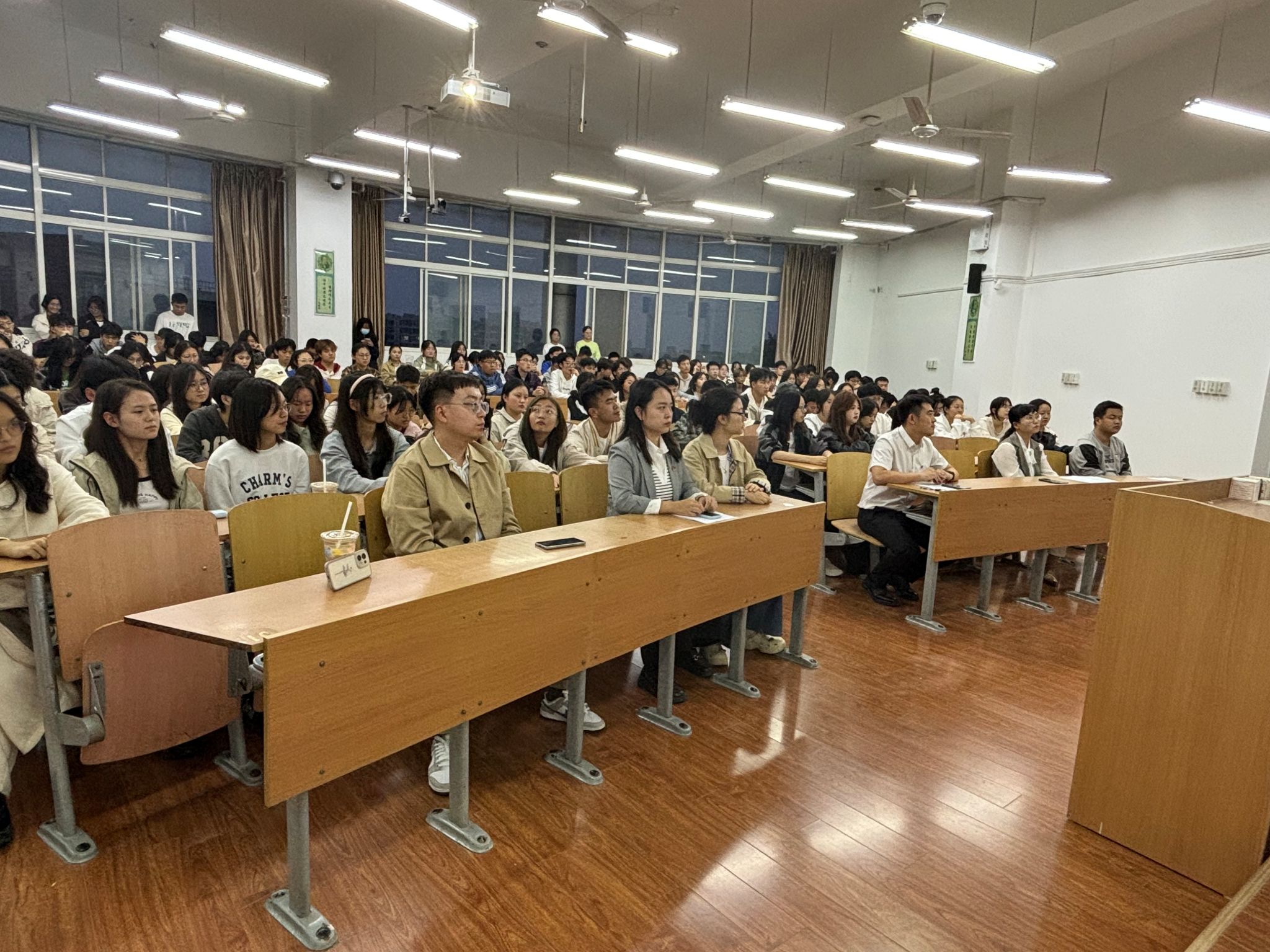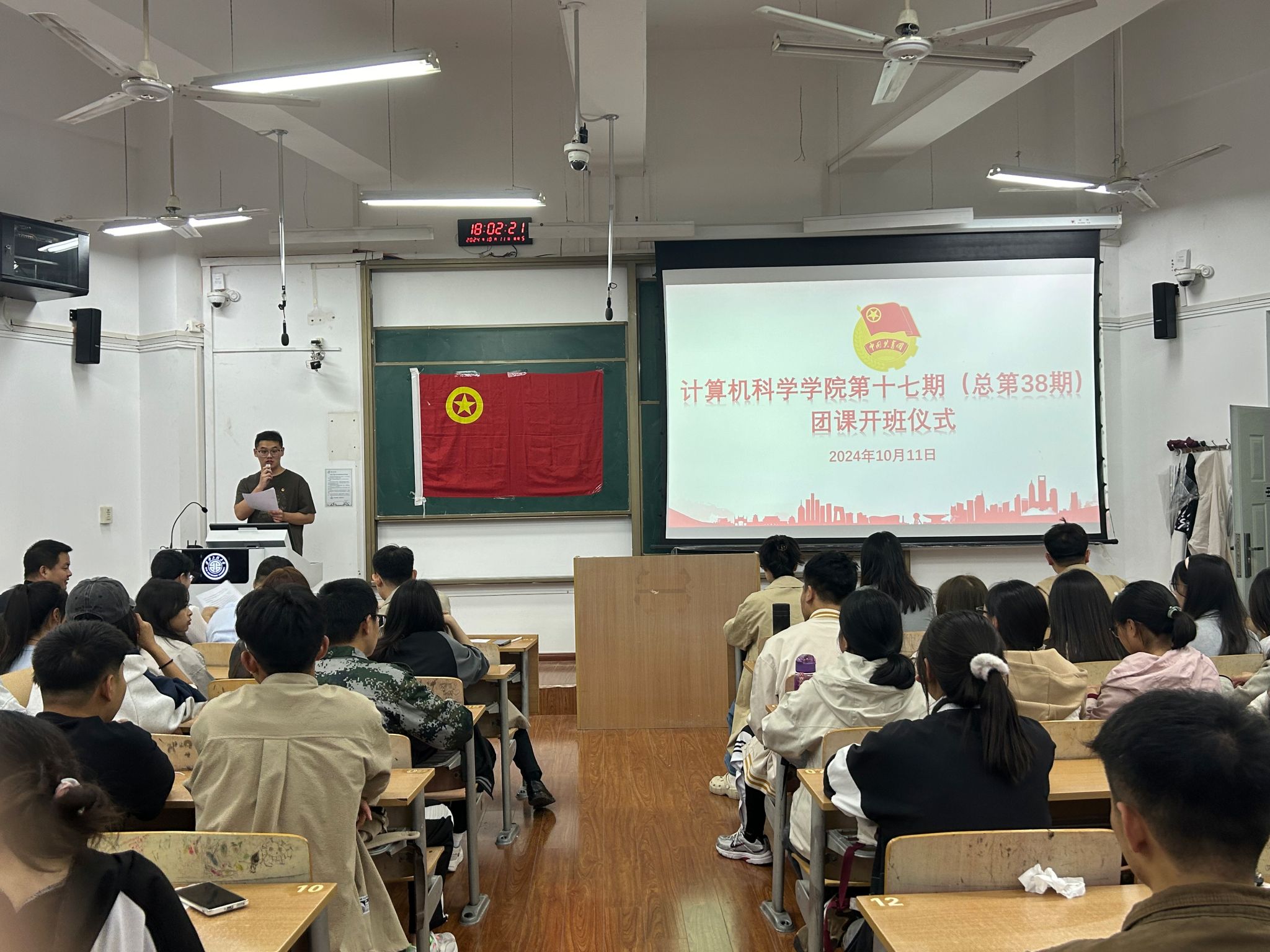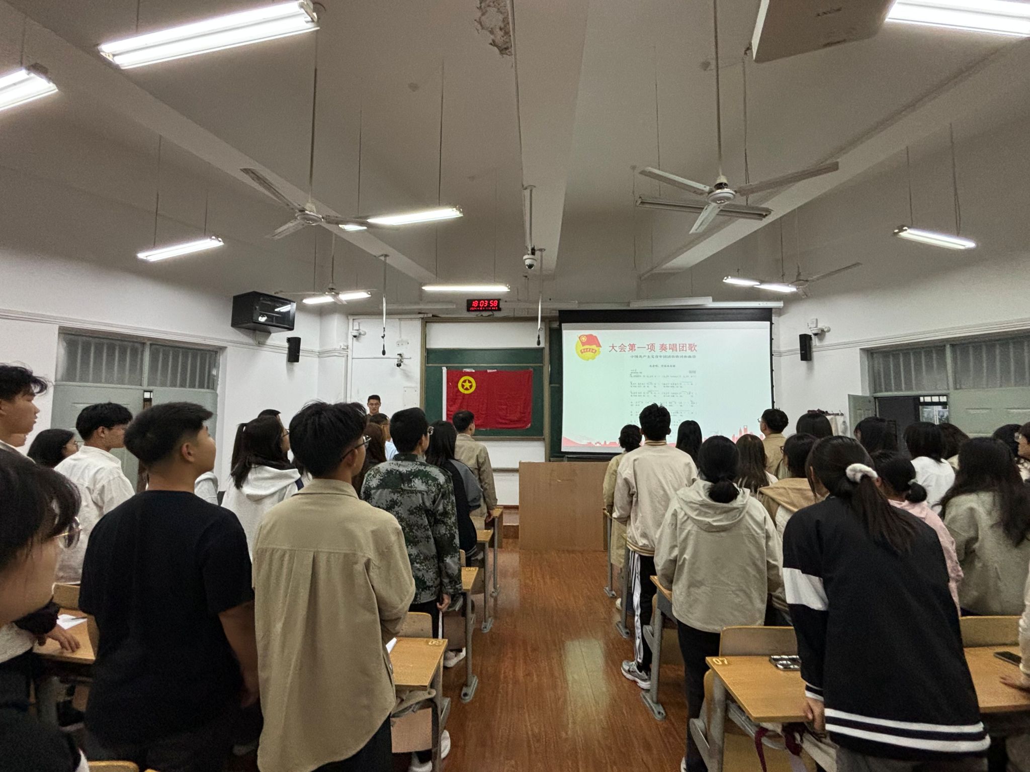 开班仪式在激昂的团歌声中开始,全体师生起立一同唱响团歌。