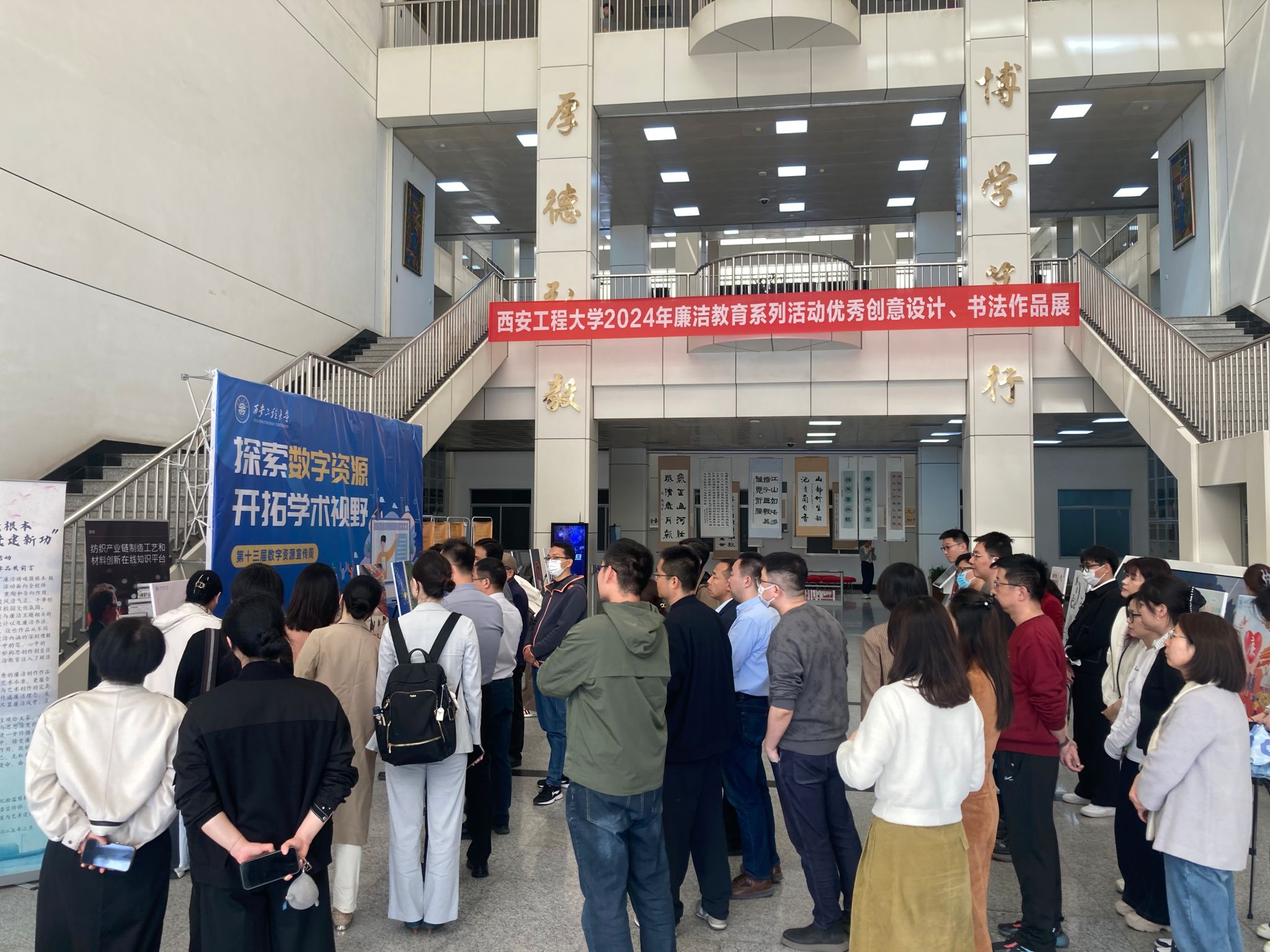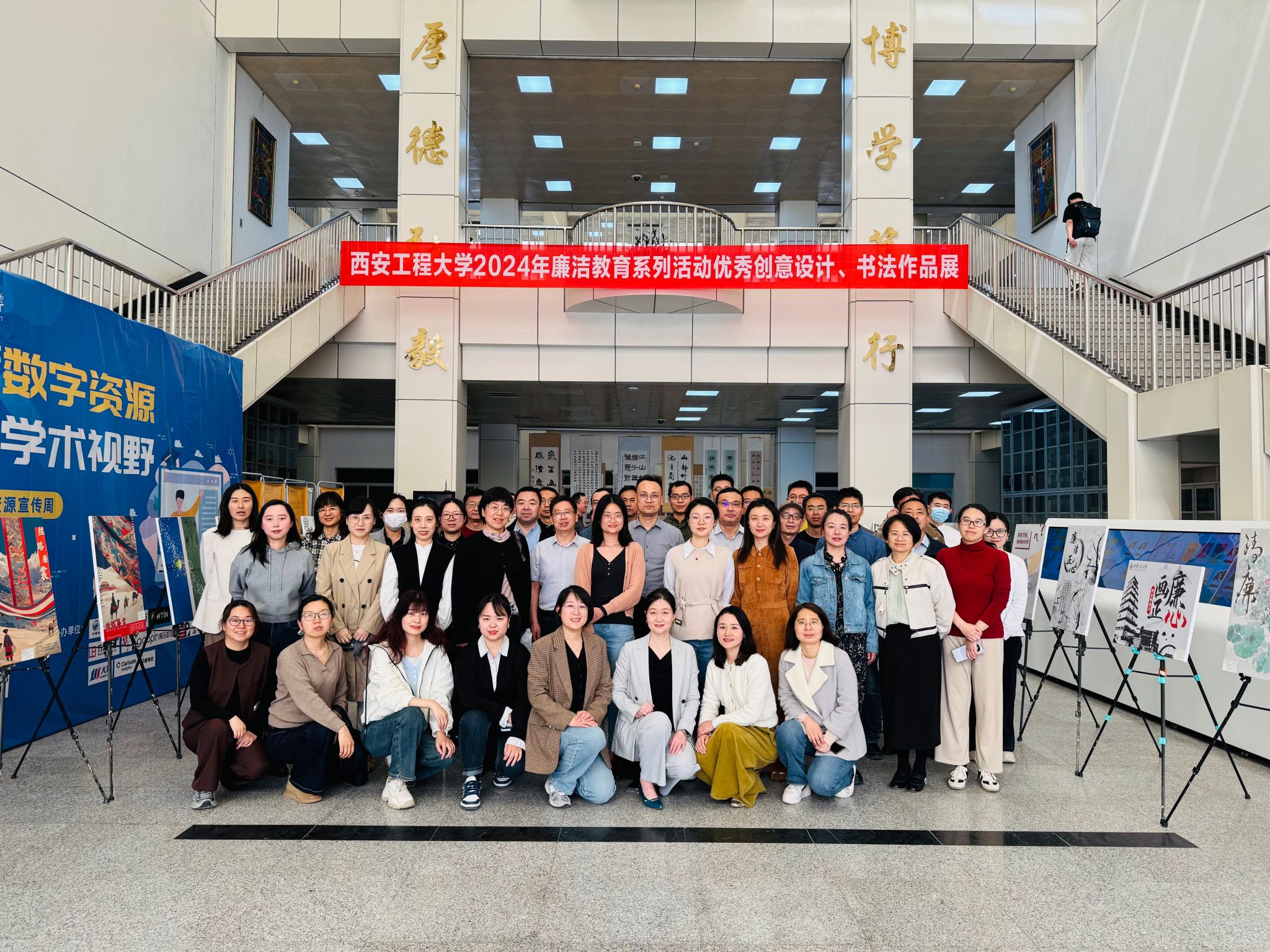 活动伊始,校纪委委员,校纪委、监察专员办公室综合室主任仝燕带领大家在图书馆一楼大厅参观了西安工程大学廉洁教育系列活动优秀创意设计、书法作品展。此次展览以多元艺术形式展现了廉洁文化内涵,涵盖创意海报、公益广告、书法作品、主题征文等多件优秀获奖作品。通过对创作背景的深度了解,老师们深刻体悟到廉洁文化与校园精神的深度融合,在艺术熏陶中接受了一次生动的廉洁教育。