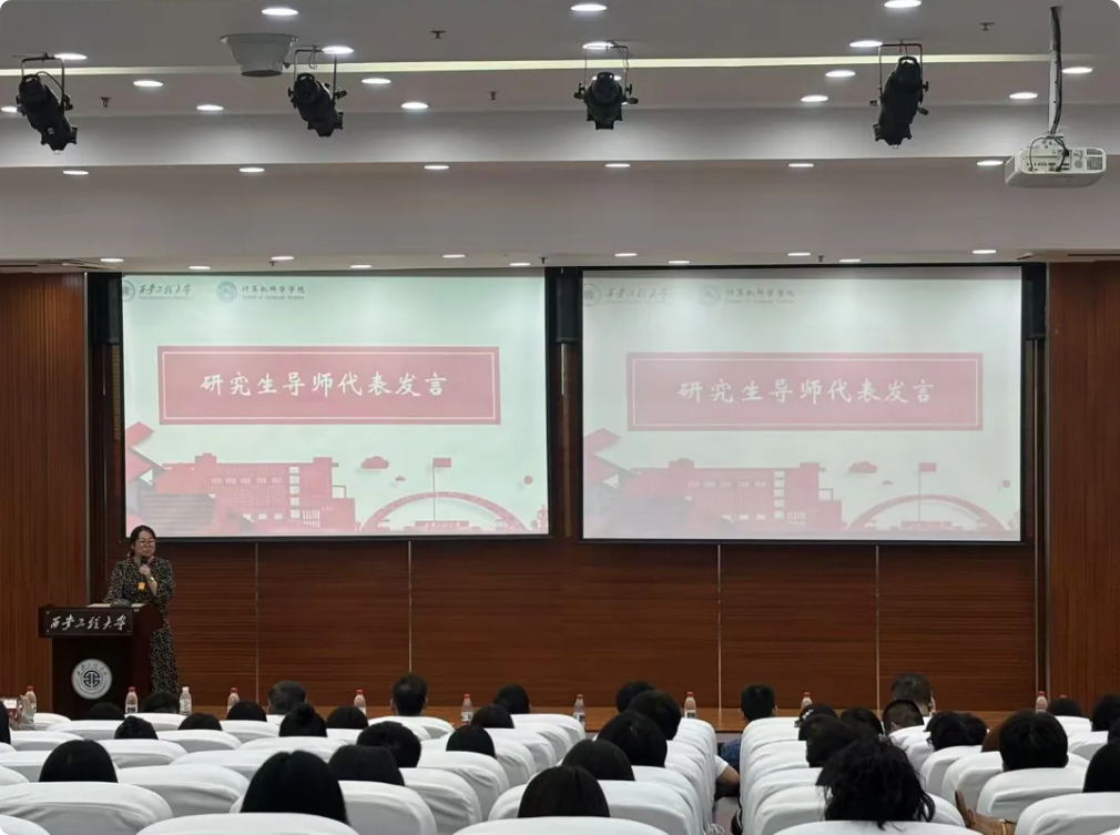 随后,老生代表刘毅晨在发言中鼓励新同学们要设定高标准,始终追求卓越,在未来的研究生生涯中保持对自己潜力的信心,勇敢面对挑战与机遇,只有通过坚持不懈的努力,才能收获丰硕成果。接着,新生代表曹志强同学在发言中表示,作为2025级新生,大家肩负着时代赋予的责任与使命,必须携手共进,奋力前行,争取在学术与科研中实现自我价值,为国家科技发展与社会进步贡献自己的智慧与力量。