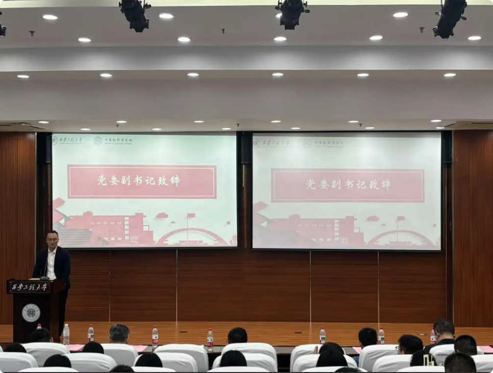 最后,党委副书记闫小兵讲话。他对新生提出四点希望:一是要立心铸魂,锚定家国方向。把学术追求融入国家需求,严守网络与意识形态底线。二是要深耕细研,锤炼科研韧劲。脚踏实地,坚守求真唯实,用好学院一流平台,多出高水平成果。三是要敢闯敢创,激发创新活力。打破思维定式,敢于探索未知,为国家科技进步、社会发展贡献力量。四是要张弛有度,守护身心之基。珍惜三年学习科研的黄金期,让自己成长为身心健康、品学兼优的高层次专门人才。
