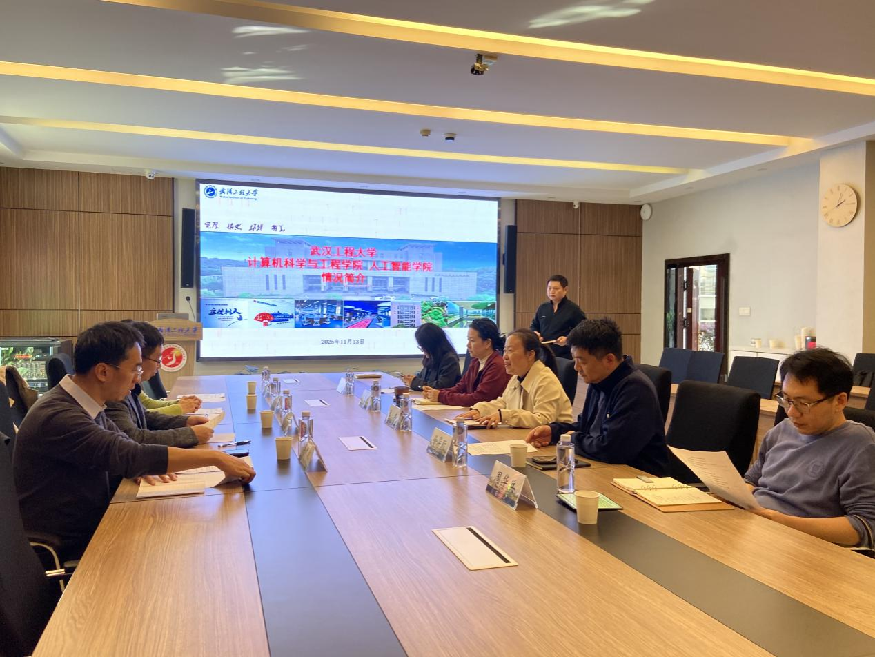 11月13日下午,调研团赴武汉工程大学计算机科学与工程学院(人工智能学院)进行第二站调研。会议在学院118会议室举行,学院党委书记张炜主持会议,院长徐华昕、党委副书记李琪娜、副院长周华兵、党委委员刘军、院长助理徐文霞参加会议。主题聚焦于“了解学院‘十四五’发展成效与‘十五五’规划构想”,双方围绕教学与人才培养、科研与学科建设、学生工作与党建三大板块进行了系统深入的研讨,包括本硕人才培养模式创新、一流专业建设、课程体系改革、产教融合、科研平台与团队建设、学科特色凝练、学生思想政治教育、党建引领业务融合等关键领域。