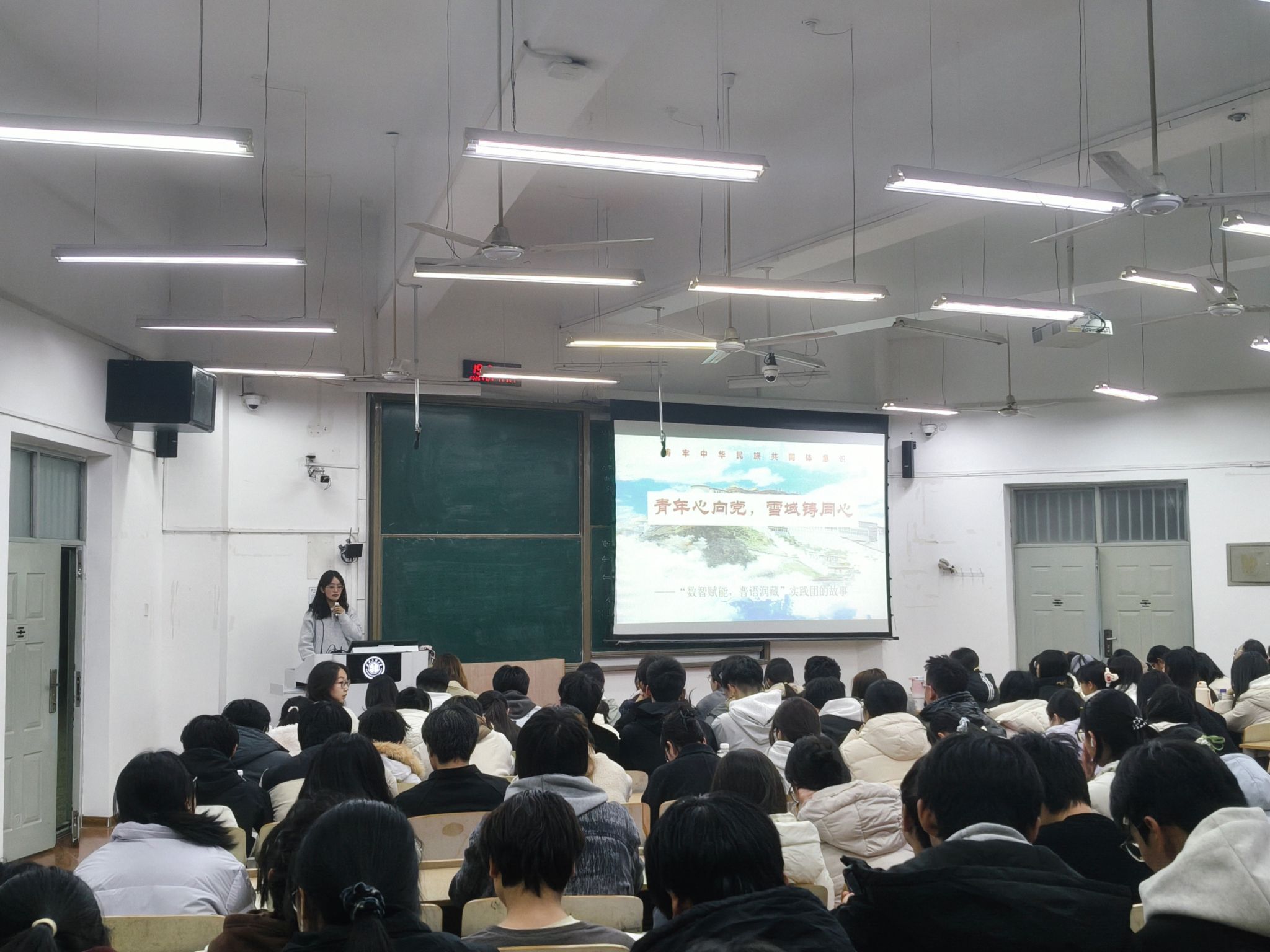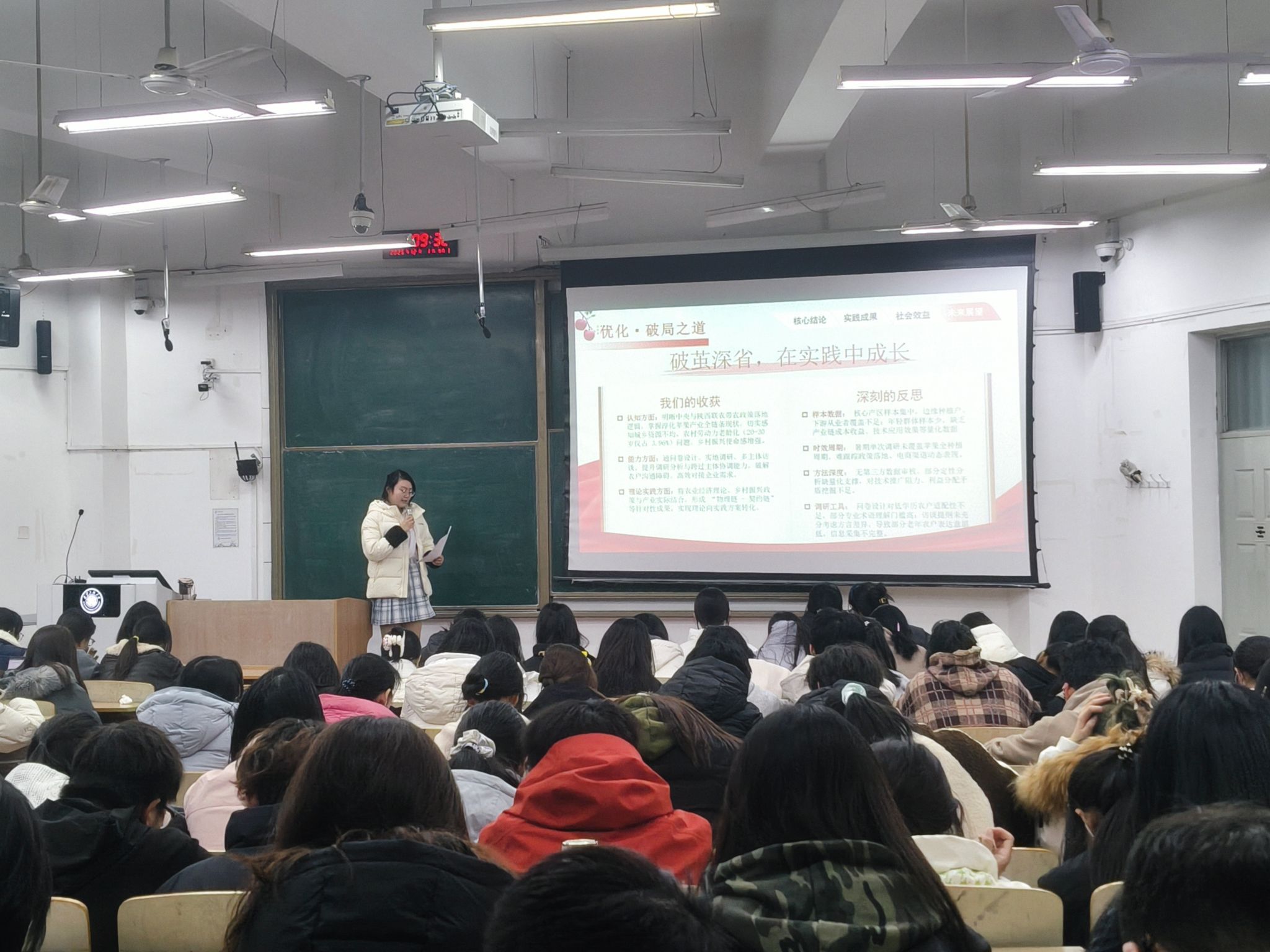 宣讲会采用“经验分享+流程解读+互动答疑”形式,精准对接学生实践需求,旨在提升青年学生的实践认知与能力,为他们搭建互相学习交流的平台。宣讲开场,主持人开宗明义地阐述了大学生开展社会实践活动的重要意义,指出社会实践是培养新时代新青年创新意识、实践能力和挺膺担当精神,提升学生综合素质、促进学生全面发展的重要载体。3支校级优秀实践队分别做了分享。“渭河果香联农同梦”队聚焦乡村振兴,讲述团队深入渭北果区,通过调研搭建线上销售体系,助力果农增收的实践历程;“乡助宜君”队展示了在支教帮扶、乡村调研等方面的工作成果,分享从“学习者”到“践行者”的成长转变;“数值赋能,普语润藏”队围绕铸牢中华民族共同体意识,介绍在高原开展数字化服务与语言推广的动人故事,彰显“缺氧不缺精神”的青年担当。