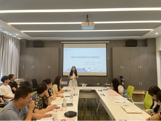 大会第一项,由毕明洋代表第三届研究生会主席团进行整体工作汇报。她从研究生会的组织结构、工作总结和工作展望方面对第三届研究生会的工作做了汇报。她希望新一届的研究生会工作能从媒体宣传、学术交流、学科竞赛、权益维护、心理健康五个方面持续加强工作力度,继续为同学们提供优质服务,将研究生会的整体工作质量不断提升。