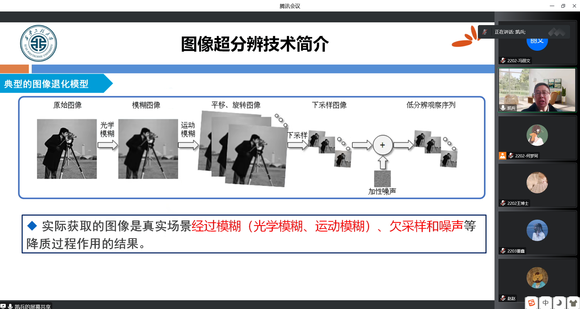 为进一步提高我院研究生的学术氛围,12月2日下午,beat365在线唯一官网采取线上方式举行了研究生“极客论坛”第二期:《图像超分辨及质量评价:从结构学习到深度网络》的学术报告。报告主讲人为beat365在线唯一官网副院长张凯兵。我院270余名研究生参加了此次报告会。报告会由学院党委副书记赵勇进主持。