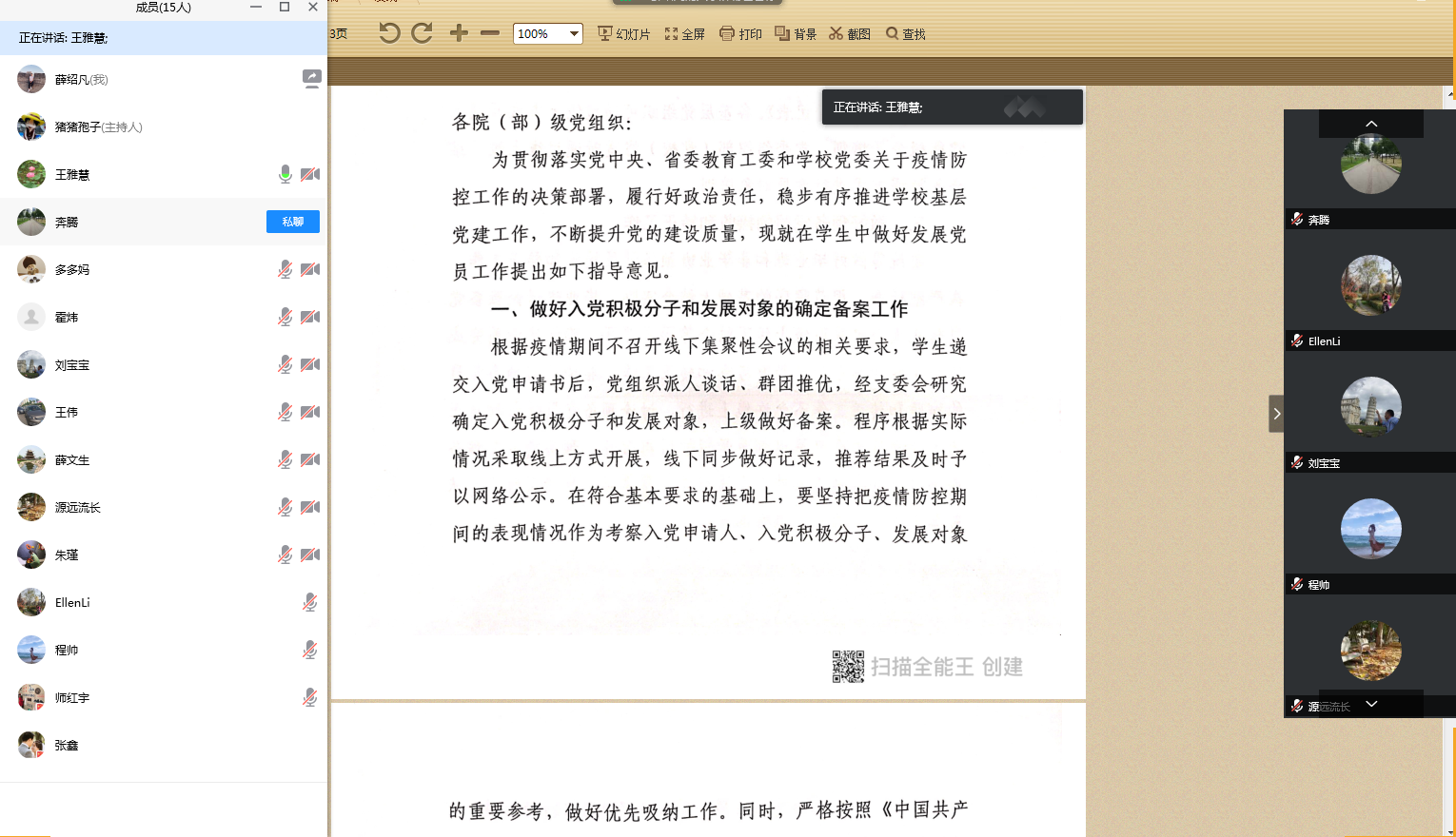 会上,王雅慧首先传达了《西安工程大学2020年组织工作要点》、《关于疫情防控期间在学生中做好发展党员工作的指导意见》等文件精神,并对以上文件进行了解读,对近期党建工作做了安排部署。之后与会成员认真学习了习近平总书记在陕西考察时的重要讲话精神,明确总书记提出的推动经济高质量发展迈出更大步伐、打造内陆改革开放高地、推动生态环境质量持续好转、加强民生保障和社会建设、推动全面从严治党向纵深发展等五项要求。王雅慧要求各党支部要组织党员认真学习习近平总书记在陕西考察时的重要讲话,深刻理解领会习近平总书记重要讲话重要指示的核心要义、精神实质并自觉用以武装头脑,切实推动工作。