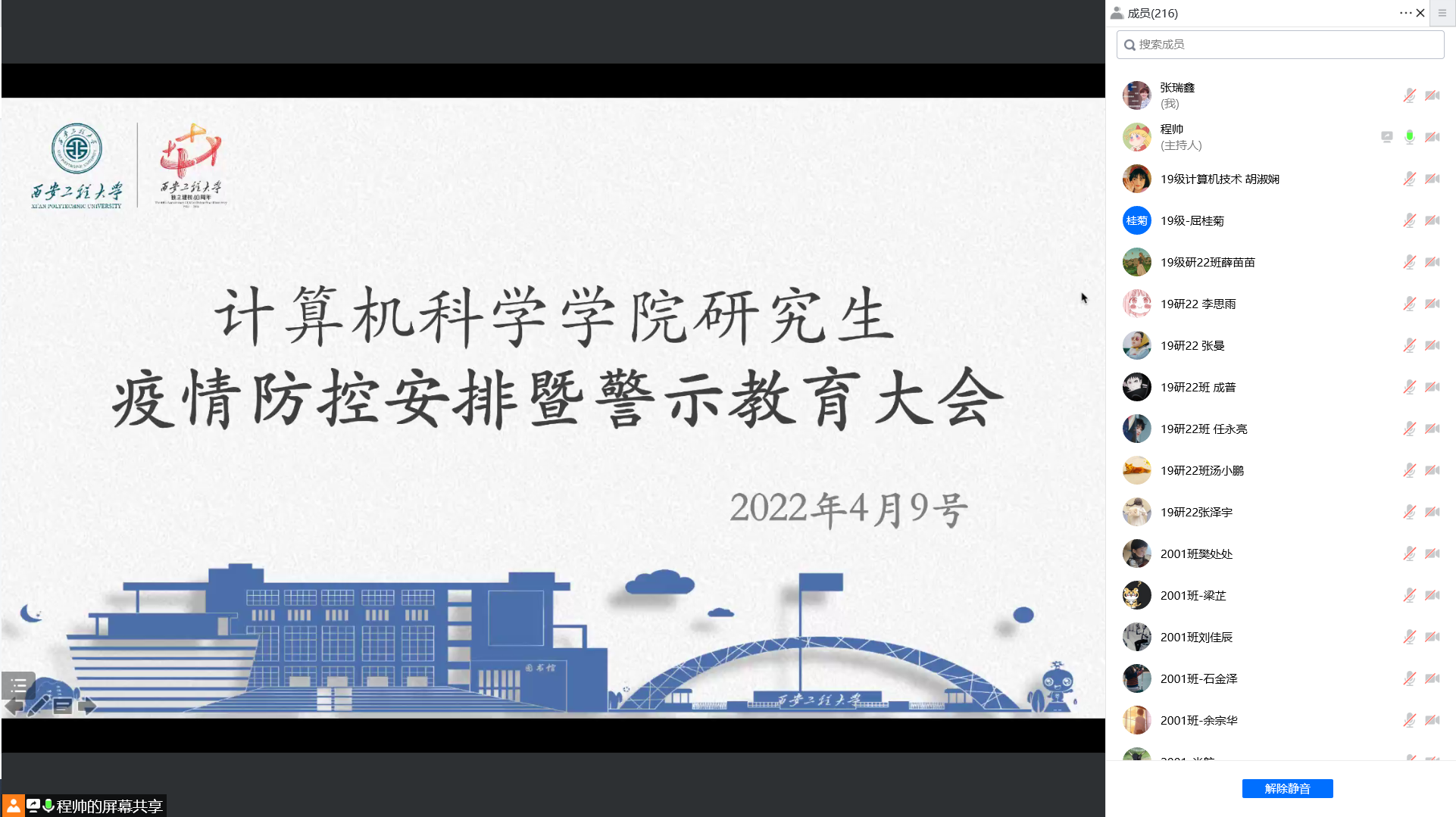 接着,程帅对全体研究生进行了警示教育。她结合《同心抗疫严守底线筑牢防线共克时艰——违反疫情防控规定典型案例警示教育录》,重点分享了各类校内及校外的典型案例,她希望每位同学能力吸取教训,引以为戒,时刻保持警觉,进一步加强自我约束,不做违反纪律的事。