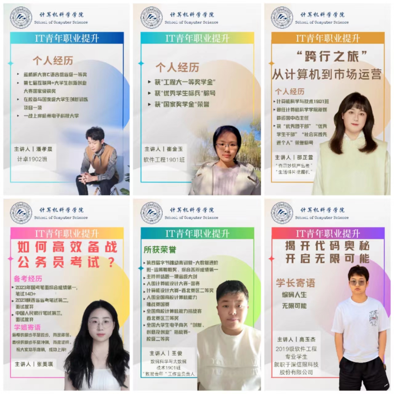 学生中获得各类奖学金的优秀代表进行经验分享,对于营造良好的学风氛围、达到学生间相互促进共同成长的目的至关重要。近日,经过前期认真准备,beat365在线唯一官网2023年“IT青年”宣讲团正式成立。宣讲团邀请了毕业生中成功升学或实现高质量就业的高年级学生担任成员,面向低年级学生分享自身经验,给予低年级同学以更好的建议和更广阔的视野去抉择未来。