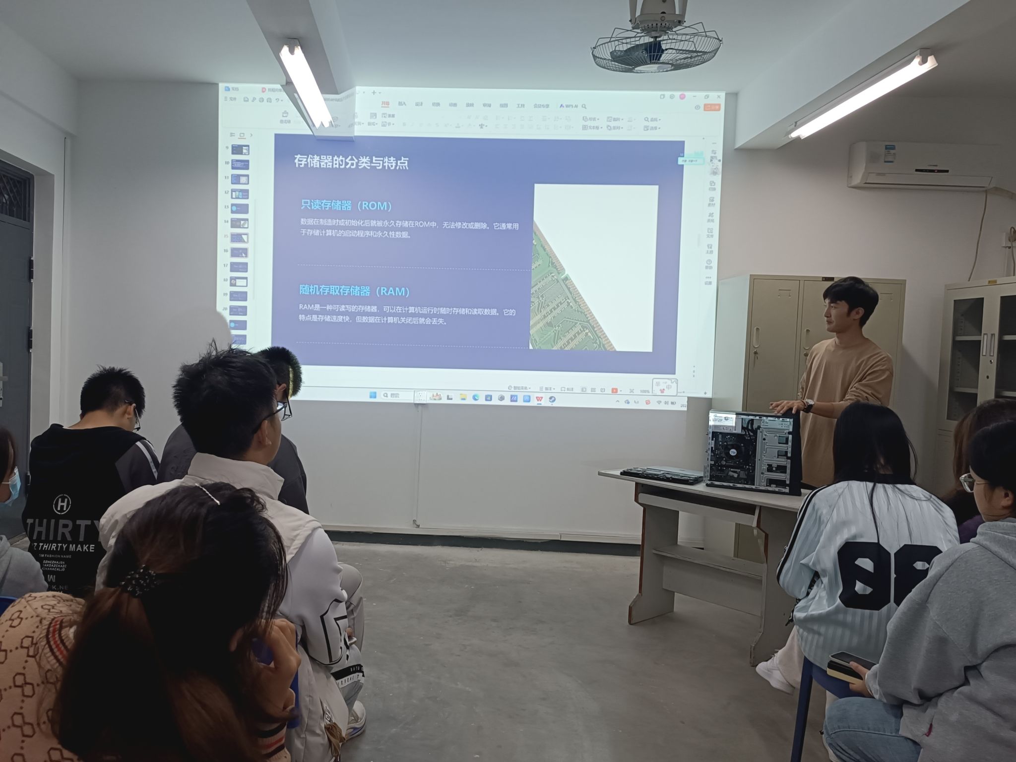 刘景天首先概述了计算机硬件的基本定义、组成、发展历程及广泛应用,随后详细讲解了运算器的定义、功能、组成及工作原理,并通过图片和现场演示生动地展示了运算器在计算机系统中的关键作用。接着,他围绕存储器这一核心部件介绍了只读存储器(ROM)和随机存储器(RAM)的特点、功能、类型及比较,深入剖析了缓存和辅助存储器的定义、功能、类型及特点,使同学们对计算机的存储器有了更为全面的认识。在讲解过程中,刘景天特别强调了存储器与控制器在计算机系统中不可替代的地位,指出它们的读写能力和信息保存功能对于计算机的正常运行至关重要。他鼓励同学们不仅要了解计算机硬件的构成与原理,更要通过实践来提升自己的动手能力。课堂引发了同学们的热烈讨论,大家纷纷表示,接下来将组建学习小组,共同探索计算机硬件技术,拓展学习知识的广度和深度。