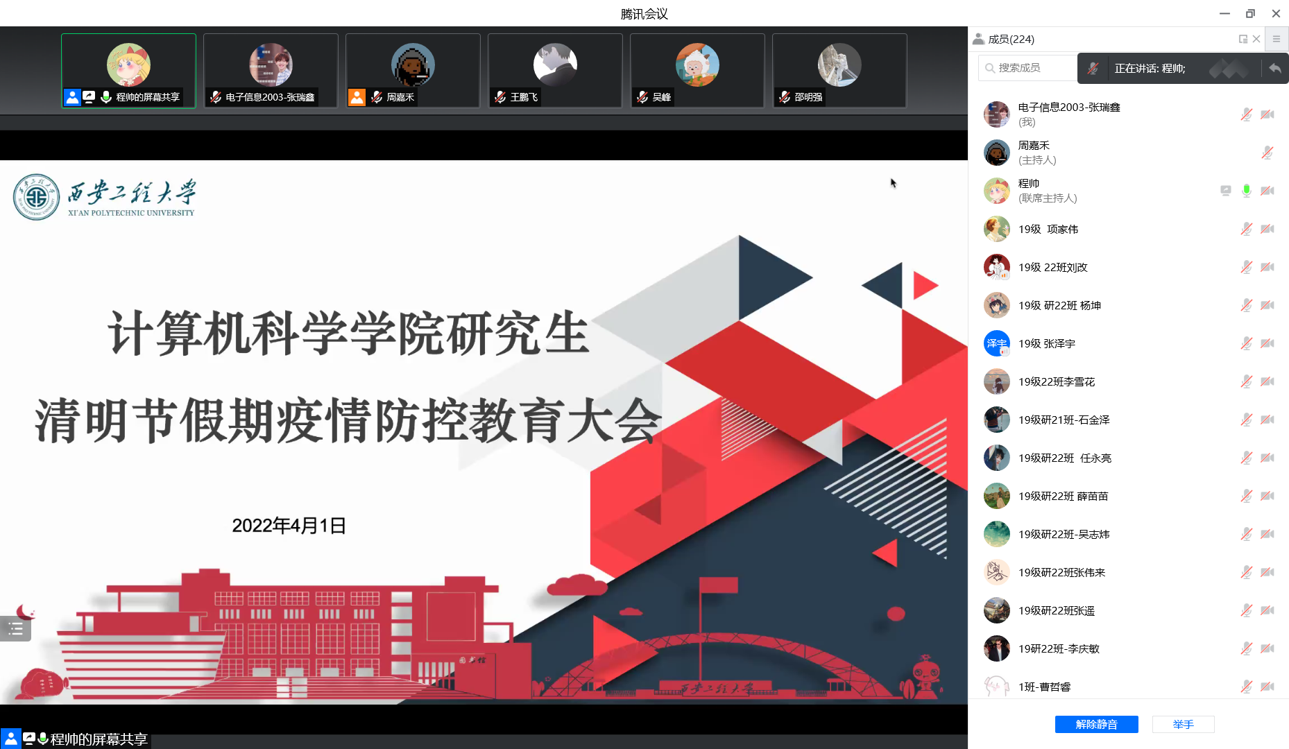 为进一步让学生了解当前疫情防控的严峻形势,提高我院研究生的疫情防范意识,避免新冠疫情校园传播风险,4月1日18点,beat365在线唯一官网在线上召开研究生清明节假期疫情防控教育大会。会议由研究生辅导员程帅主持,全体研究生参加了此次会议。