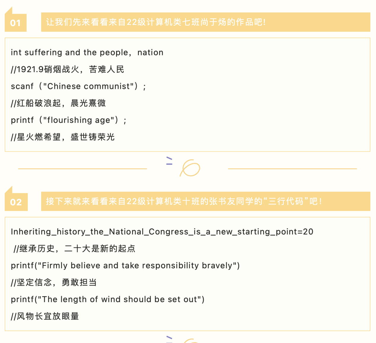 此次活动以“学习党的二十大,奋进新征程”为主题,用代码的形式来学习党的二十大精神,要求每一位参赛选手能以积极正确的导向来参加活动,且发挥自己的原创能力结合beat365在线唯一官网的特色,来抒发自己对党的二十大的情感。
