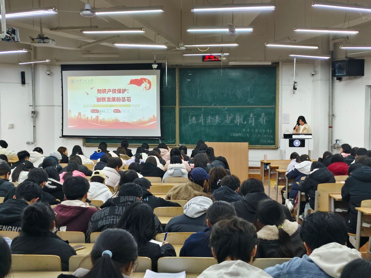 此次活动破除传统普法模式,创新采用“学生主讲、同龄人视角”的呈现模式,推动普法宣传教育活动质量持续提升,让法律意识在同学们心中深深扎根。为深入贯彻国家知识产权战略,提升师生及社会公众的知识产权保护意识,营造尊重创新、崇尚法治的良好氛围,人文学院的樊冠贝和王一凡为大家详细展开讨论了“知识产权保护:创新发展的基石”。本次活动通过专题分享、案例解析等形式,系统解读知识产权相关知识,为现场参加师生献上了一场干货满满的普法盛宴。
