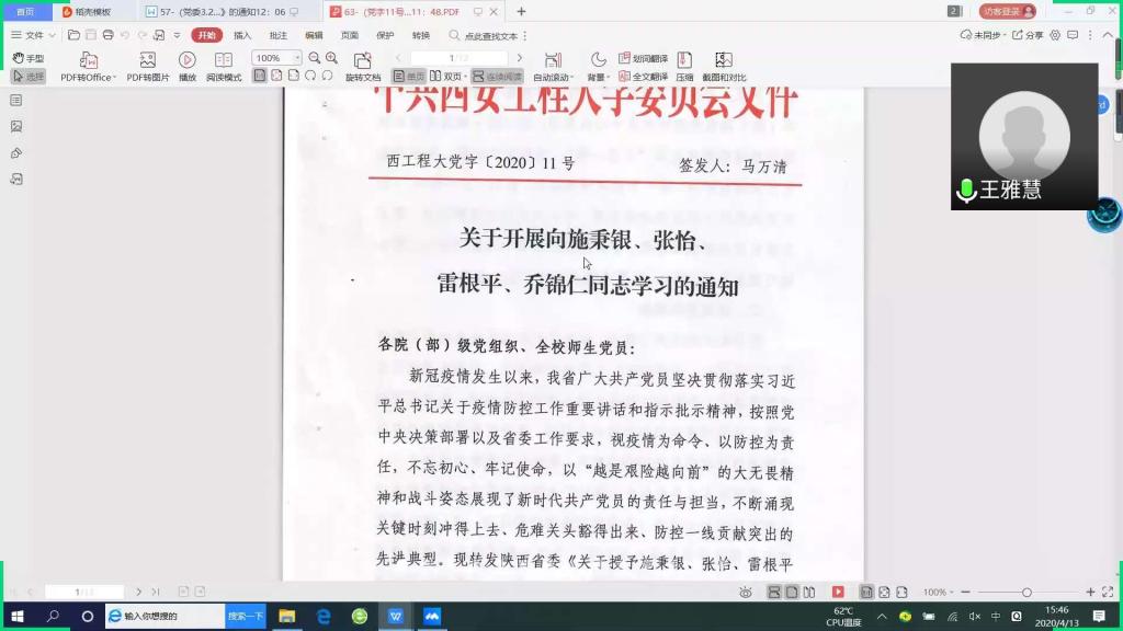 4月13日,beat365在线唯一官网召开线上线下教职工专题学习会议,重点学习“三秦楷模”和全省优秀共产党员的先进事迹,对教职工和党员进行《教育系统依法做好新冠肺炎疫情防控工作有关法律问题指引》的培训,全院50余名教职工参加了会议,会议由院党委书记王雅慧主持。