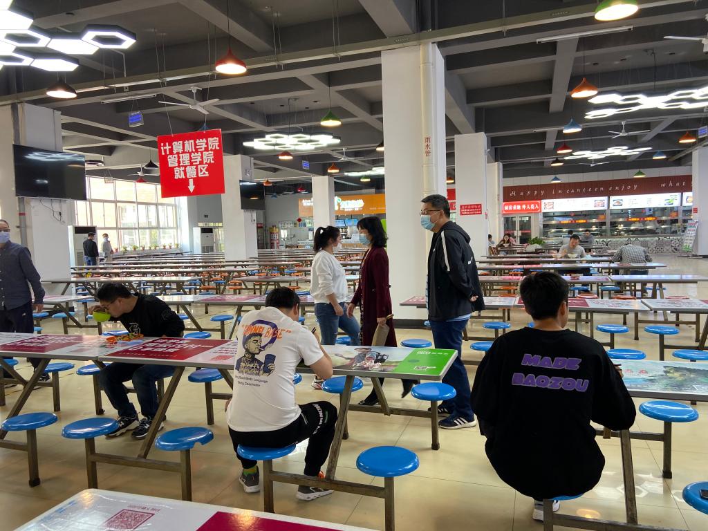 5月11日上午,院领导和辅导员又来到学院学生的定点堂食餐厅进行了防疫安全检查。在现场,对学生就餐聚集的人群进行了疏散教育,并就学生堂食就餐的注意事项与食堂负责人进行了深入的沟通交流,以期合力管控好学生的有序用餐。