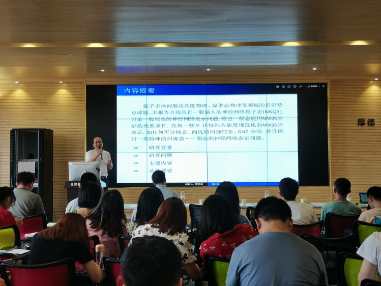 曹怀信提到量子多体问题是高能物理、凝聚态物理等领域的前沿热点课题,由于量子波函数所需要的参数会随着粒子数的增加呈指数增长,因此,如何对其模拟成为量子理论中的难点问题。他从一般输入可观测量的量子神经网络态(NNQS)出发,谈论了一般纯态的神经网络表示问题,同时,他又以能用规范化的NNQS来表示的N比特纯态为切入点,讲述了图态的神经网络表示问题。