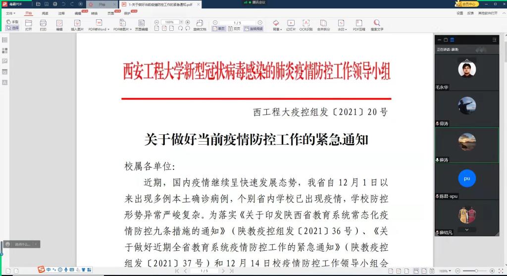 首先,薛涛带领教职工学习了《关于做好当前疫情防控工作的紧急通知》。他强调要求,全体教职工原则上不出省、非必要不出市、无特殊情况不离开学校,特别是研究生导师,要教育学生遵守学校疫情防控相关规定,同时要加强对学生的督查;所有值班人员,务必按时到岗,严格执行值班备勤要求履行职责,及时摸排安全隐患,发现问题第一时间上报学院。接着,薛涛传达了学校第十七次本科教育教学工作会议精神,对后期学院专题讨论作了安排和部署。