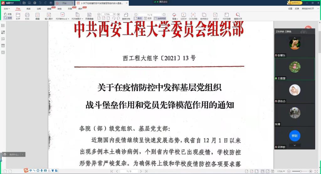 最后,学院党委书记王雅慧传达了学校《关于在疫情防控中发挥基层党组织战斗堡垒作用和党员先锋模范作用的通知》精神。她要求全院上下要提高政治站位,统一思想,凝聚共识,深刻认识当前疫情防控的重要性紧迫性。一是强化责任担当,书记、院长切实履行第一责任人职责,带头扛起疫情防控政治责任,亲自挂帅、靠前指挥,做到守土有责、守土尽责;二是要坚决落实上级和学校疫情防控纪律和要求,做到“教职工非必要不出市、学生非必要不出校”,如确需外出的务必办理好出行报备和请销假手续;三是要通过各种形式宣传疫情防控知识,帮助引导师生树立正确的疫情防控理念,停止举办聚集性活动,倡导采用线上方式举办。四是主动配合疫情筛查检测,教育引导身边师生做好个人科学防护,做到不信谣、不传谣、不造谣,不随意转发、不恶意评论、不以谣传谣。五是严格落实主动报告制度,遇到重大情况和突发事件务必第一时间向学院和社区报备,同时做好学生教育引导和心理疏导,做要好家人的安全保护。(撰稿:吴艳杰 审稿:王雅慧)