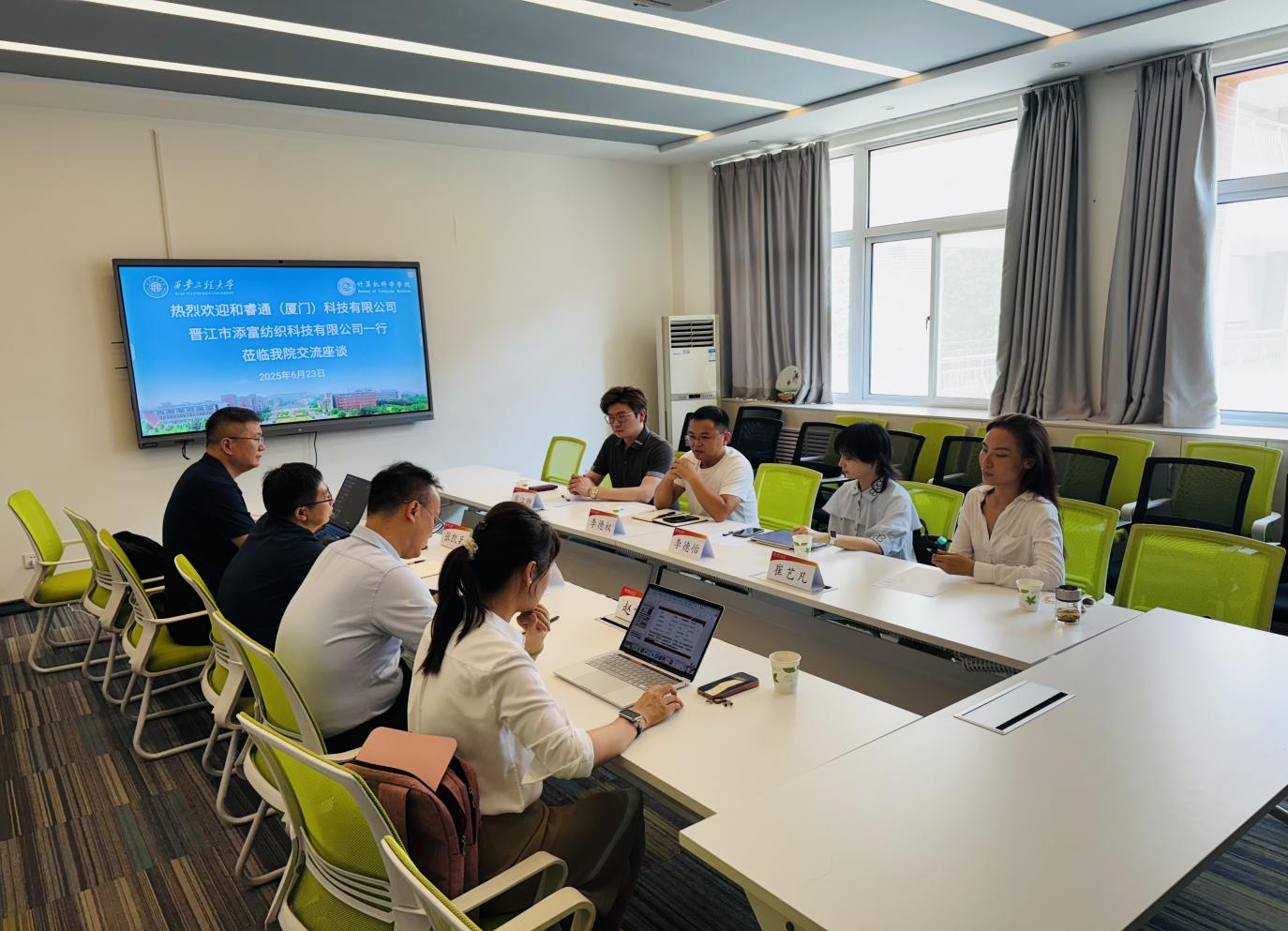 6 月 23 日,和睿通(厦门)科技有限公司董事长李德权、商务经理李德怡一行莅临beat365在线唯一官网,就共建“工业物流研究中心”与beat365在线唯一官网开展专题研讨。晋江市添富纺织科技有限公司总经理蔡江狮、市场经理崔艺凡,学院党委副书记闫小兵、软件工程系毋涛副教授、赵雪青教授参加座谈会,座谈会由学院副院长张凯兵主持。