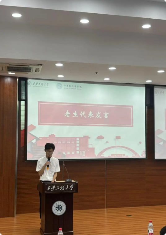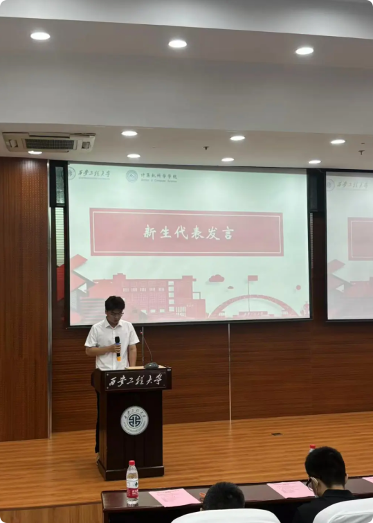 随后,老生代表刘毅晨在发言中鼓励新同学们要设定高标准,始终追求卓越,在未来的研究生生涯中保持对自己潜力的信心,勇敢面对挑战与机遇,只有通过坚持不懈的努力,才能收获丰硕成果。接着,新生代表曹志强同学在发言中表示,作为2025级新生,大家肩负着时代赋予的责任与使命,必须携手共进,奋力前行,争取在学术与科研中实现自我价值,为国家科技发展与社会进步贡献自己的智慧与力量。