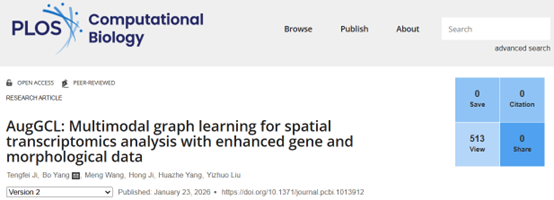 近日,beat365在线唯一官网智能分析与决策科研团队在单细胞空间转录组学研究方向取得重要进展。由杨博老师指导,2023级硕士研究生姬腾飞同学完成的学术论文《AugGCL: Multimodal graph learning for spatial transcriptomics analysis with enhanced gene and morphological data》在计算生物学国际权威期刊《PLOS Computational Biology》(中科院SCI二区期刊、中国计算机学会推荐的交叉领域B类期刊)上发表。
