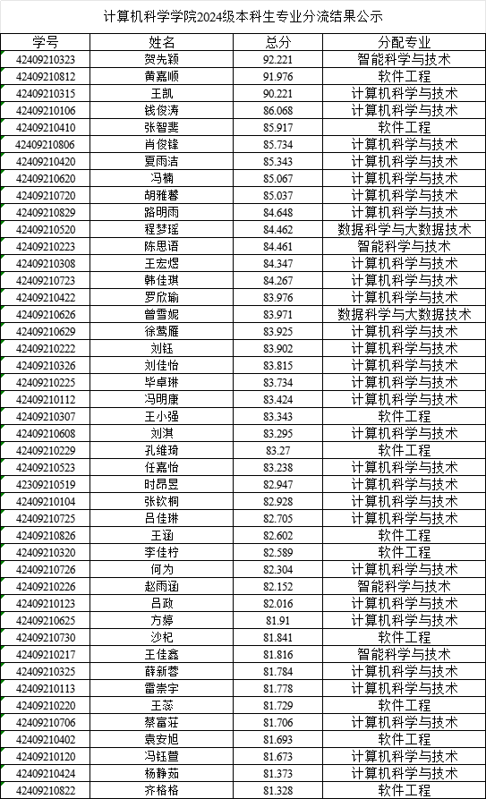 据《关于印发<西安工程大学本科生大类招生专业分流及转专业管理办法>的通知》(西工程大教字[2025]19 号)等文件要求,我院制定并下发了《西安工程大学beat365在线唯一官网大类招生专业分流实施细则》。经个人填报志愿、工作小组审核排队成绩、专业分流领导小组对分流结果进行审议,拟分配贺先颖等241名2024级学生至智能科学与技术等专业,现将分流结果及个人成绩等信息予以公示。(详见附表)