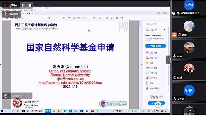 1月18日,为更好地组织我院2022年度国家自然科学基金项目的申报工作,深入解读2022年国家自然科学基金改革的各项新举措,进一步提高国家自然基金申报质量,科技处联合学院在线举办了国家自然科学基金第二轮校内评审会。会议由薛涛院长主持,陕西师范大学雷秀娟教授、西安电子科技大学王晗丁教授受邀作国基申报经验分享。科技处处长朱耀麟、2022年拟申报基金教师及相关工作人员等30余人参加了会议并进行交流讨论。