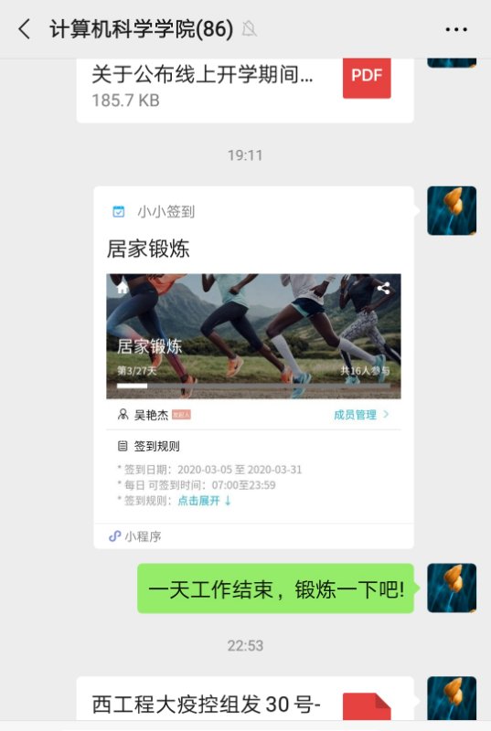 我校目前已经线上开学二周了,许多教师、行政人员每天居家办公、准备网课、在线教学、信息统计等等,花费大量时间面对电脑屏幕、手机,大多足不出户,锻炼身体就显得尤为重要了。在三八妇女节这个属于女同胞的节日里,学院女教职工们积极参加了居家锻炼活动打卡,相互鼓励,坚持锻炼。此次锻炼活动将持续一周,相信会有越来越多的老师加入健身的行列,让我们用积极的心态抗击疫情,用更加充沛的精力投入线上教学工作中,期待在不久的将来,在满园春色的校园里相聚!(撰稿:吴艳杰 审稿:王雅慧)