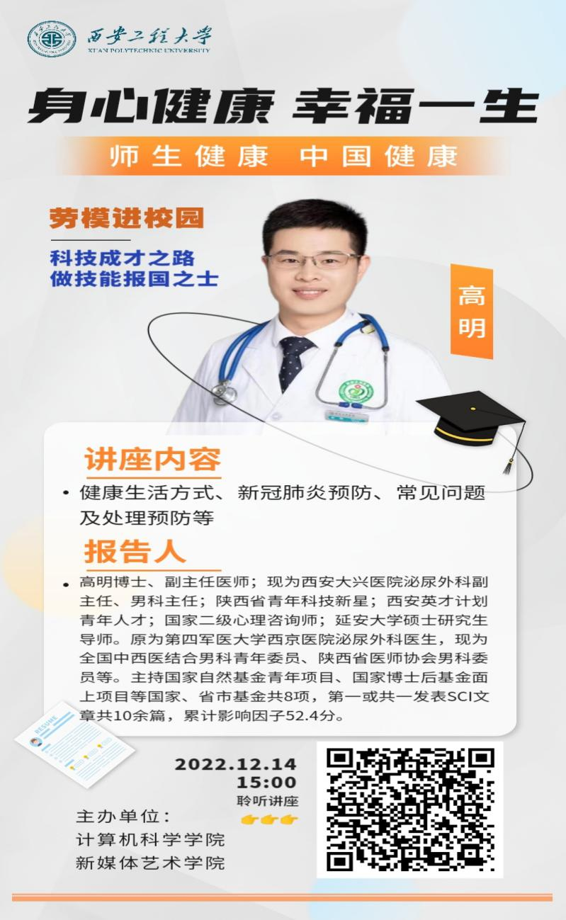 为进一步弘扬劳模精神,劳动精神、工匠精神,充分发挥劳模工匠的示范引领、辐射作用和社会实践“第二课堂”作用,培育和践行社会主义核心价值观,坚持全员育人、全方位育人、全过程育人,助力广大学生成长成才。2022年12月14日下午,beat365在线唯一官网与新媒体艺术学院联合举办了以“科技成才之路做技能报国之士”为主题的劳模工匠进校园活动,特邀请“陕西省青年科技新星”、西安大兴医院高明博士做“师生健康中国健康”专题讲座。两学院师生、学生家长、教职工家属收看了讲座直播。讲座由两个学院党委书记共同主持。